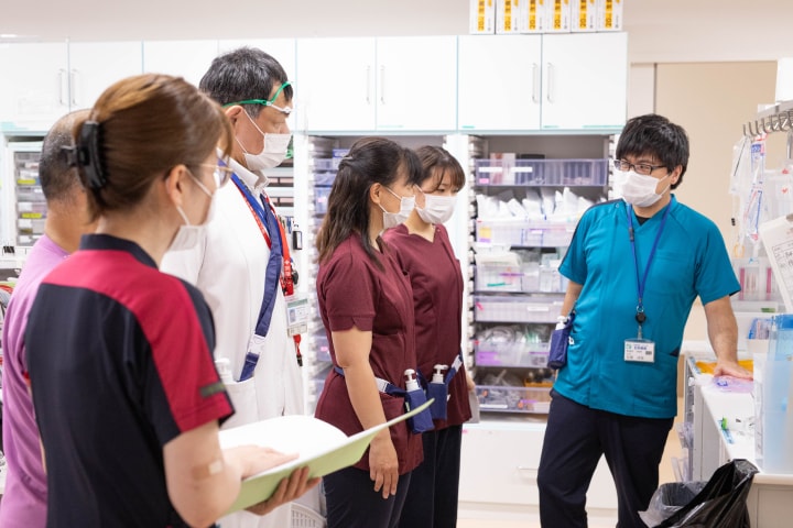 薬剤師が中心となり外来化学療法委員会を設置。外来・入院患者さんの化学療法に積極的に関わり、医師・看護師と共に処方設計や副作用対策など個々の患者さんにとってより良い治療選択が出来るよう努めています。さらに、薬剤師が安心して抗がん剤を調製できるようにするため、手技の教育や環境整備(無菌室完備、閉鎖式器具導入など)にも尽力しています。
